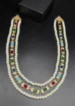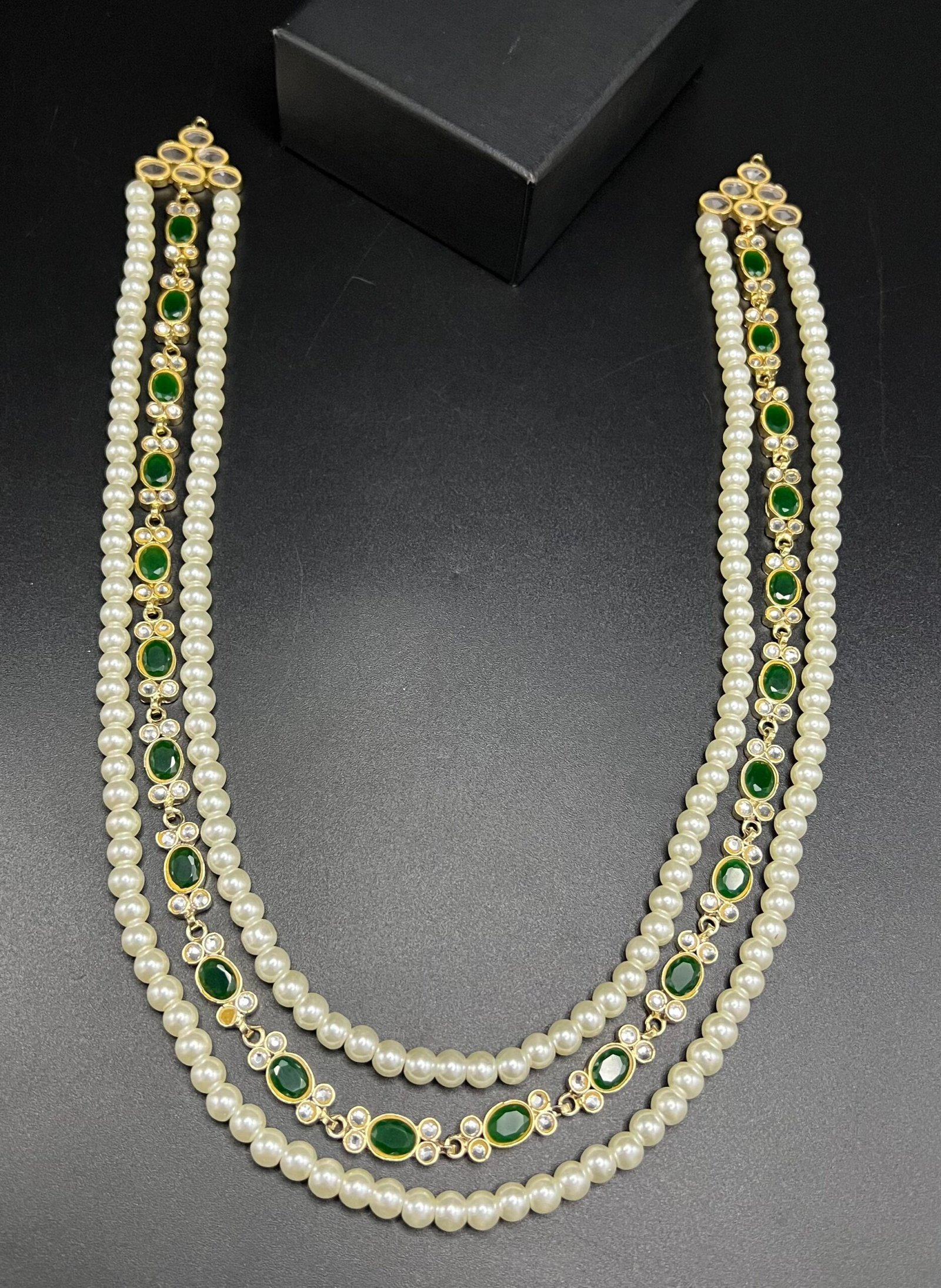 An elegant 3-line Kundan mala beautifully crafted with classic white pearl settings for a timeless traditional look. Fine craftsmanship and graceful detailing make it perfect for weddings and festive occasions.