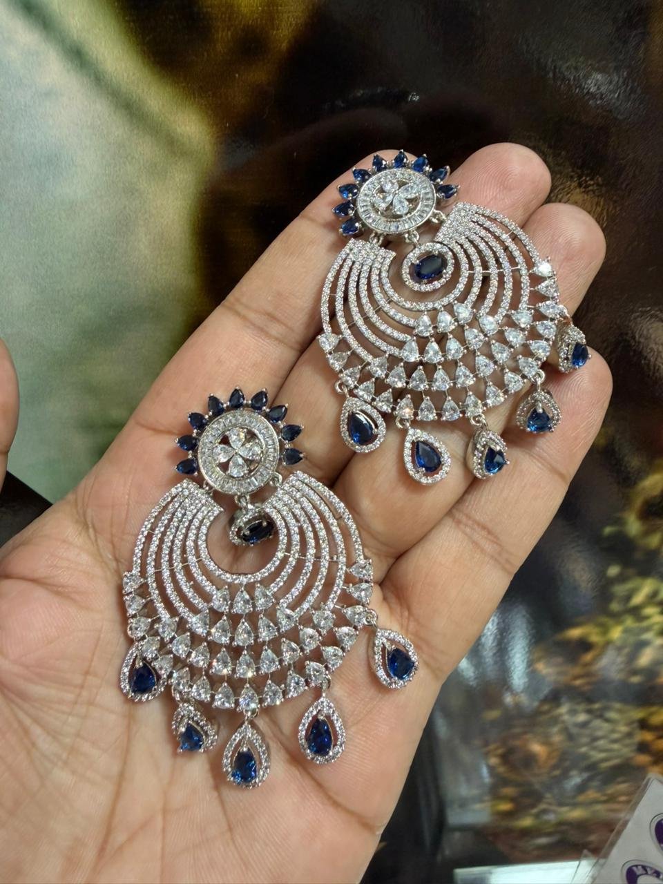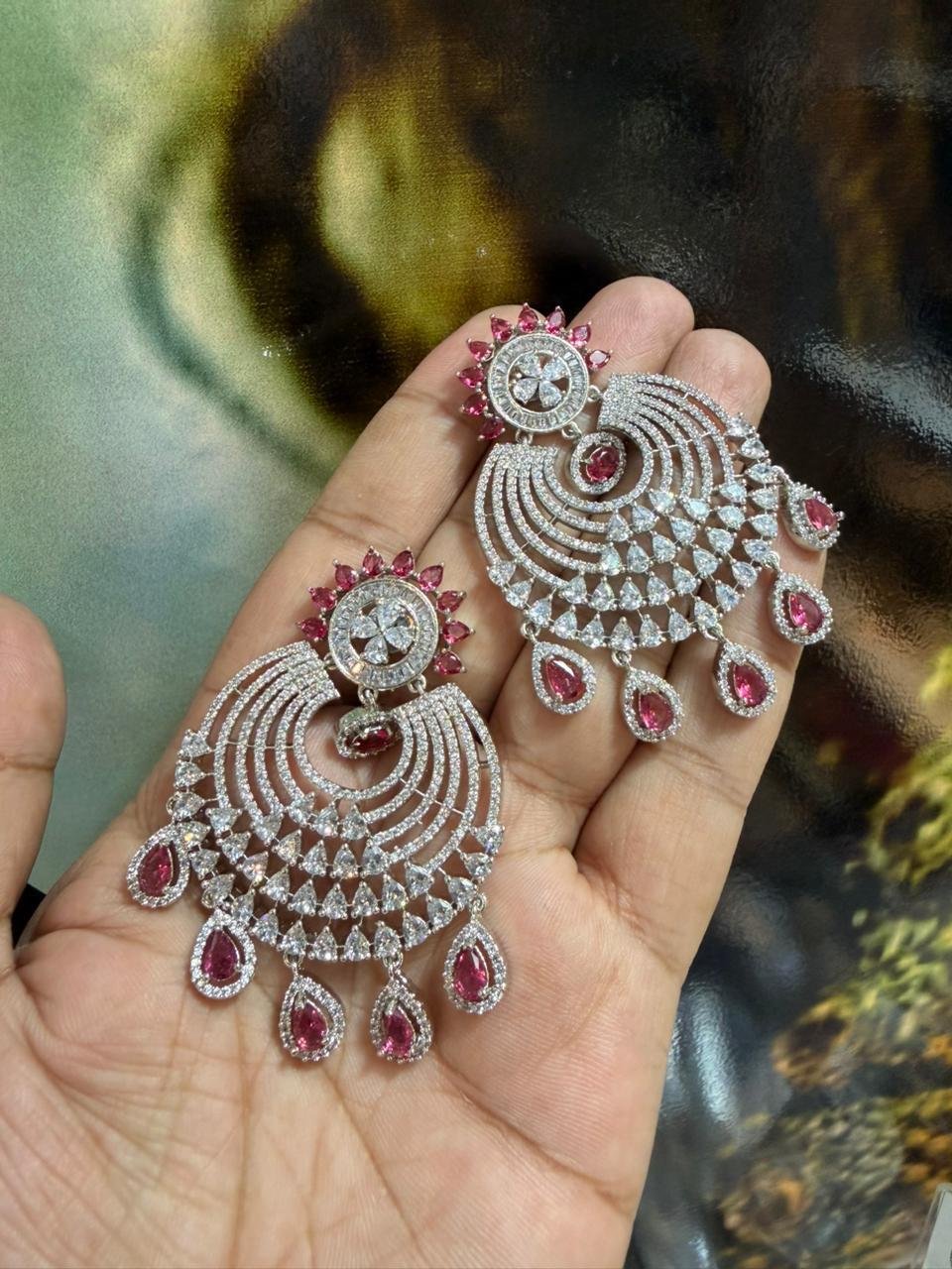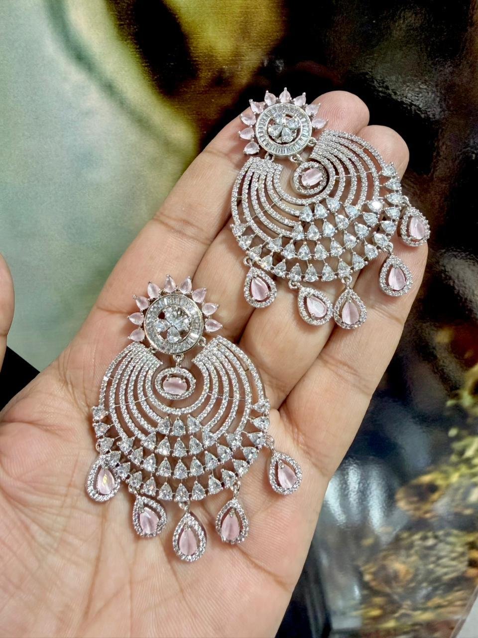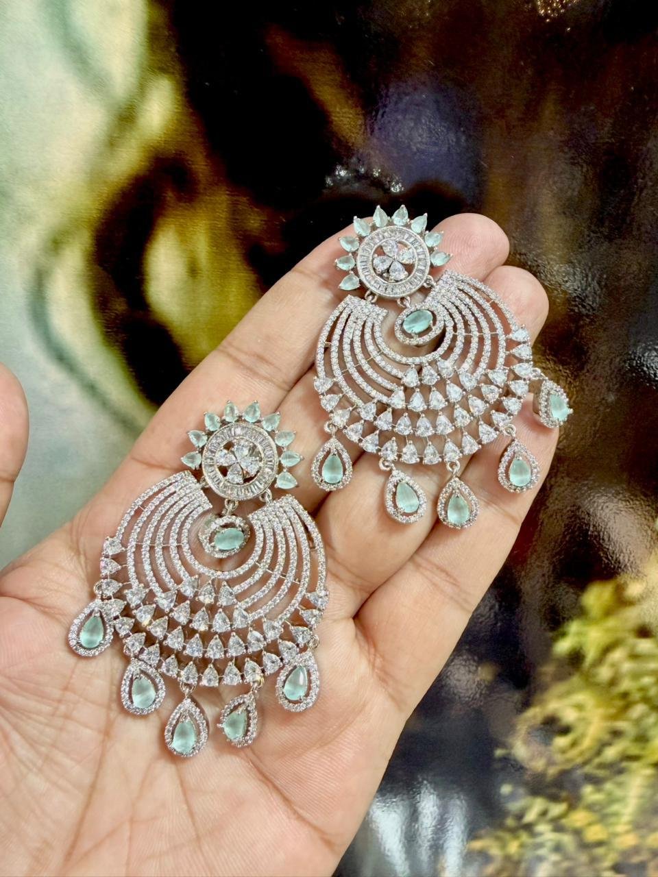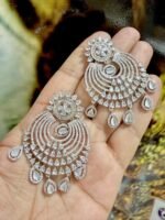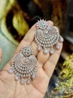 Exquisitely crafted American Diamond earrings adorned with genuine, real stones for brilliant sparkle. Designer collection featuring elegant detailing, perfect for parties, weddings, and festive occasions.