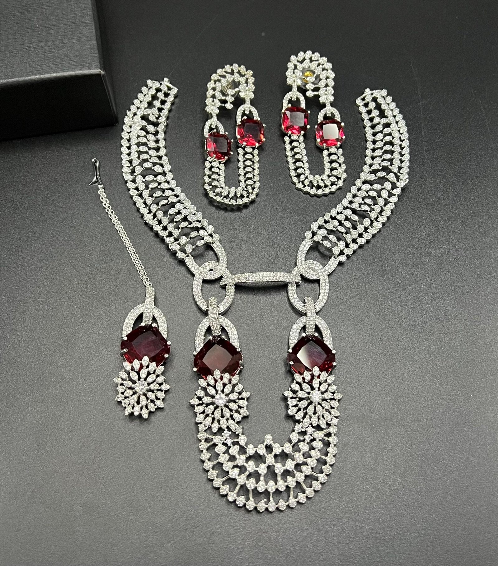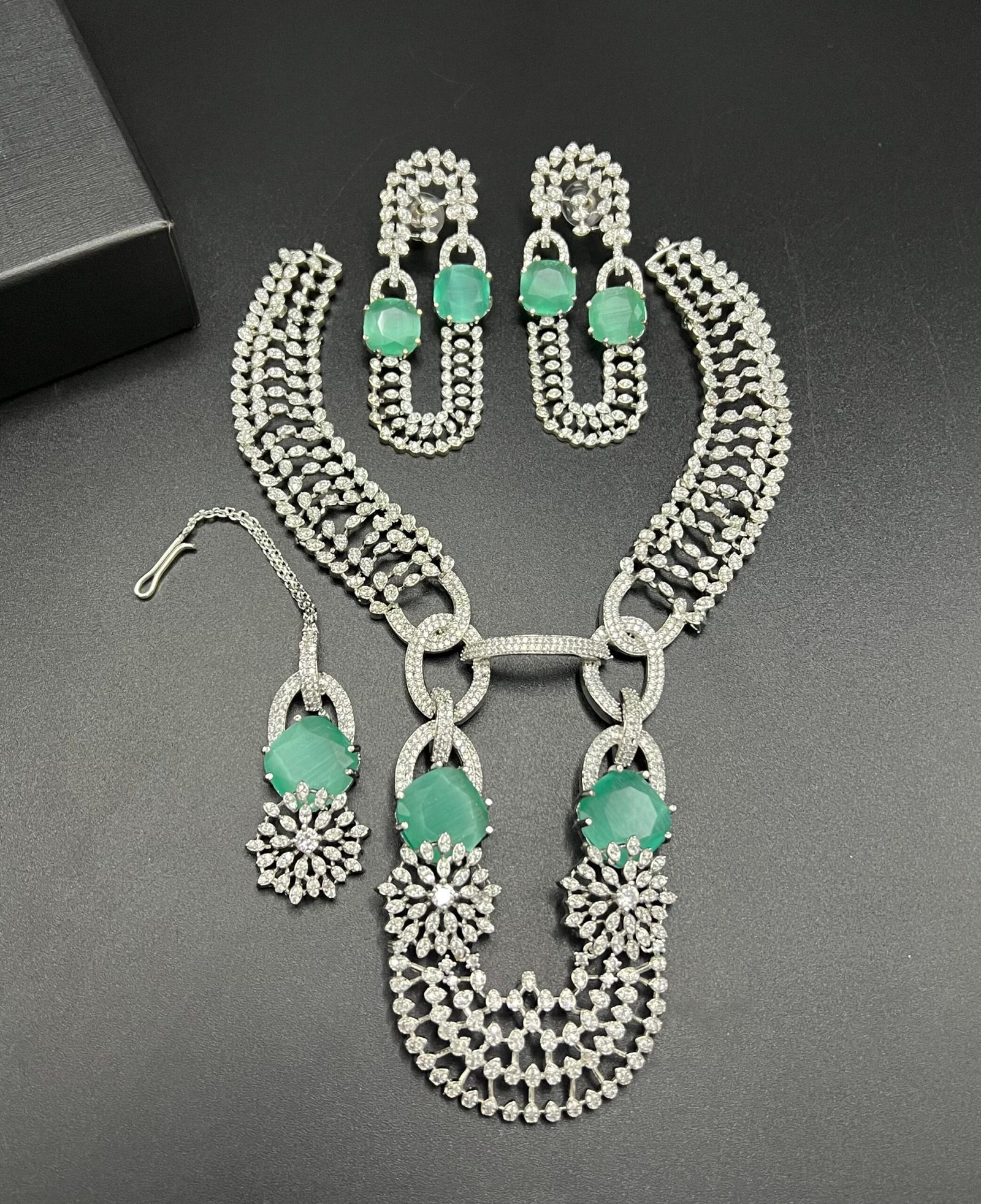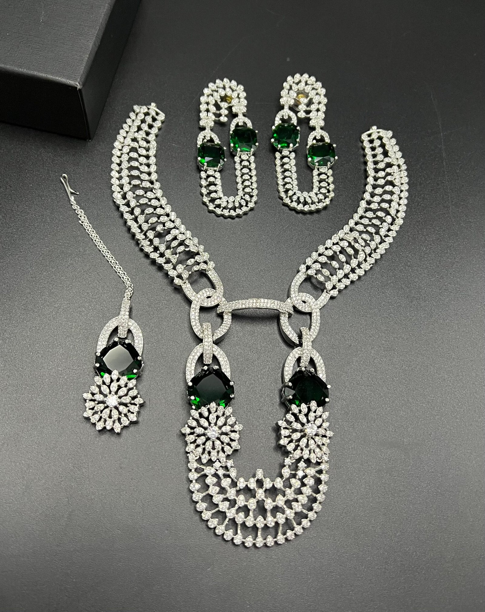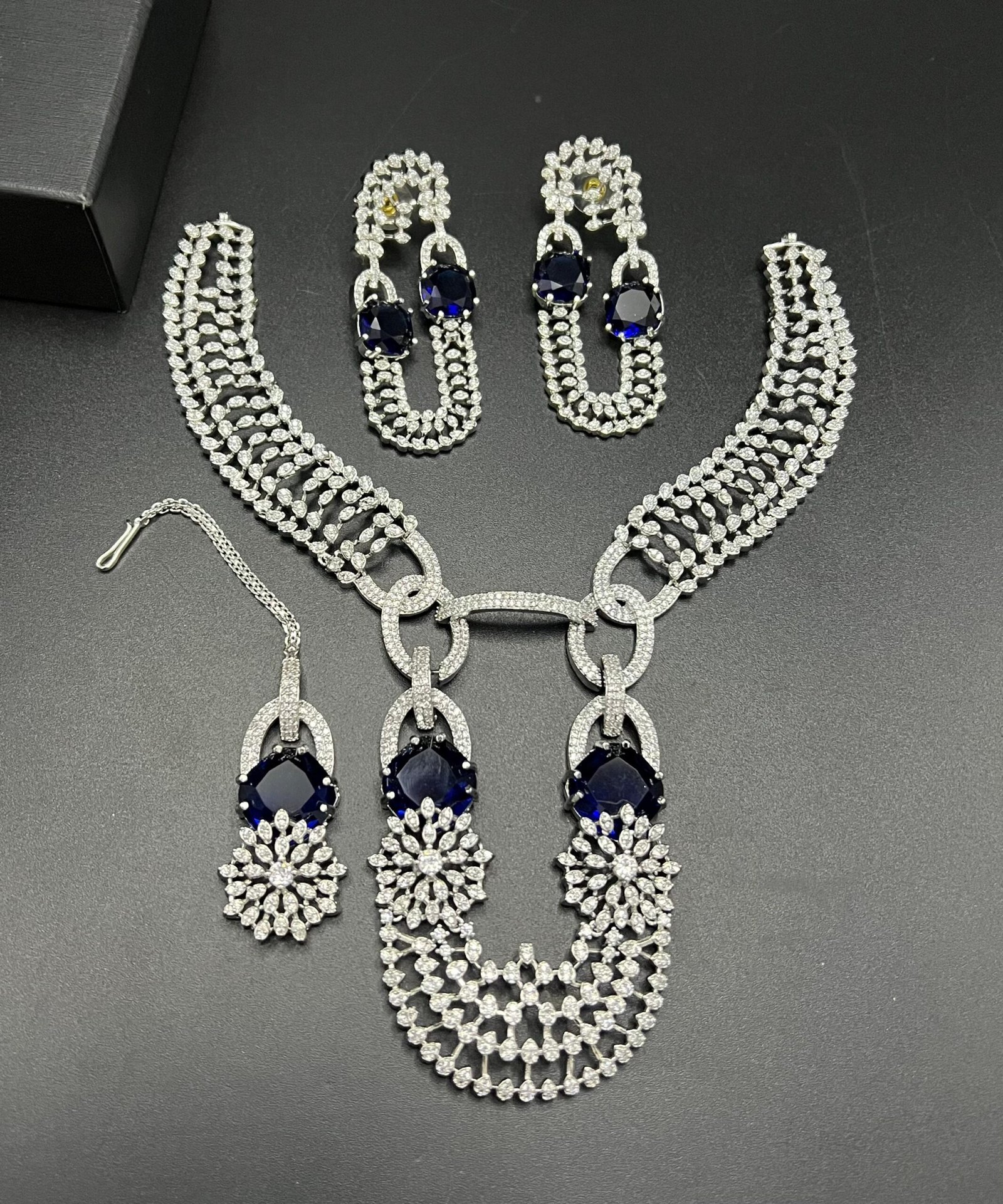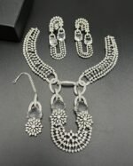 SKU: N/A Categories: Bridal Collection, Party Wear Sets Tags: american diamond partywear set, Designer Party Necklace Set, High shine AD jewelry, Luxury American Diamond collection, Premium festive jewelry, Real stones AD jewelry, Wedding fashion accessories