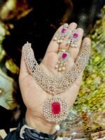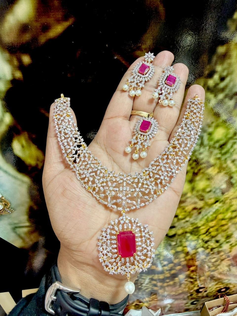 A beautifully crafted American Diamond jewelry set featuring genuine, real stones for a brilliant, luxurious shine. Ideal for weddings, parties, and elegant festive styling.