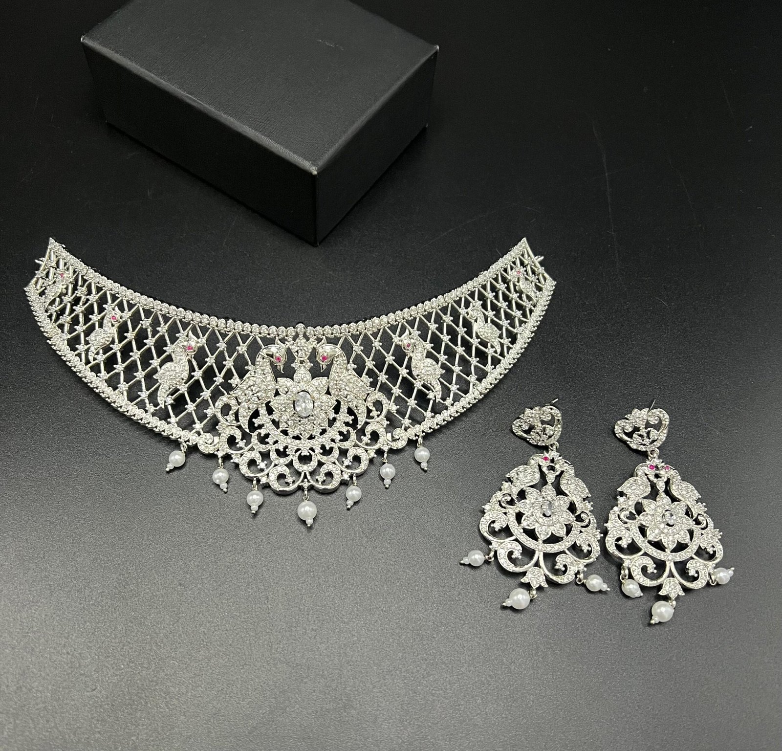 SKU: N/A Category: Party Wear Sets Tags: American Diamond zircon set, designer ad collection, High shine zircon set, Luxury American Diamond jewelry, Premium partywear set, Real zircon stones jewelry, Wedding fashion accessories