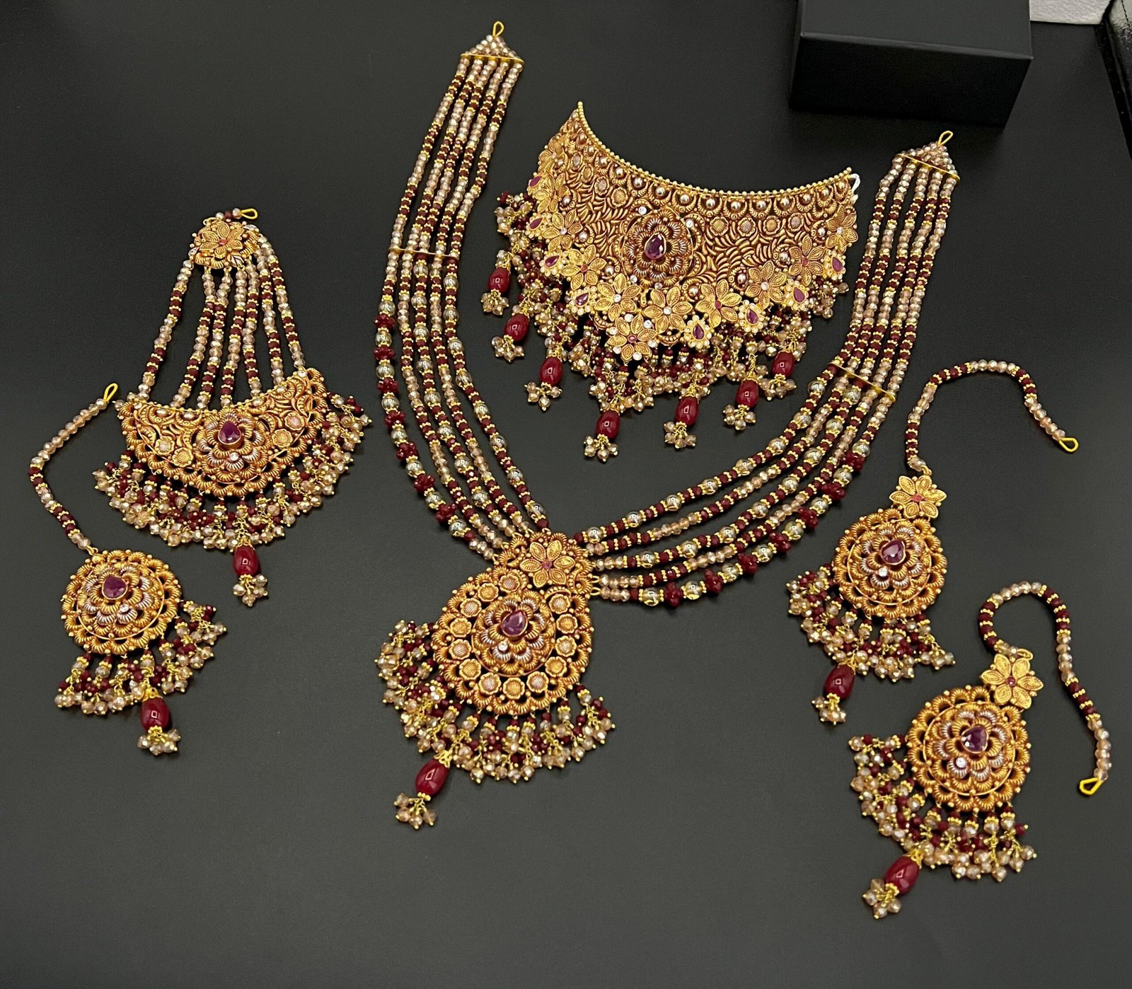 A luxurious bridal set crafted with fine quality real stones and a stunning gold-plated finish. Perfect for weddings, receptions, and grand festive occasions.