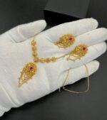 Elegant gold-plated locket set with intricate floral detailing and red stone embellishment. Perfect for casual wear, party wear, and gifting.