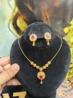 An elegant gold-plated partywear jewelry set featuring a genuine ruby real stone for rich sparkle. Designer craftsmanship and premium finish make it perfect for parties, weddings, and festive occasions.
