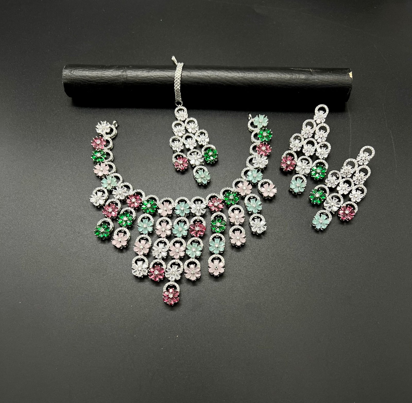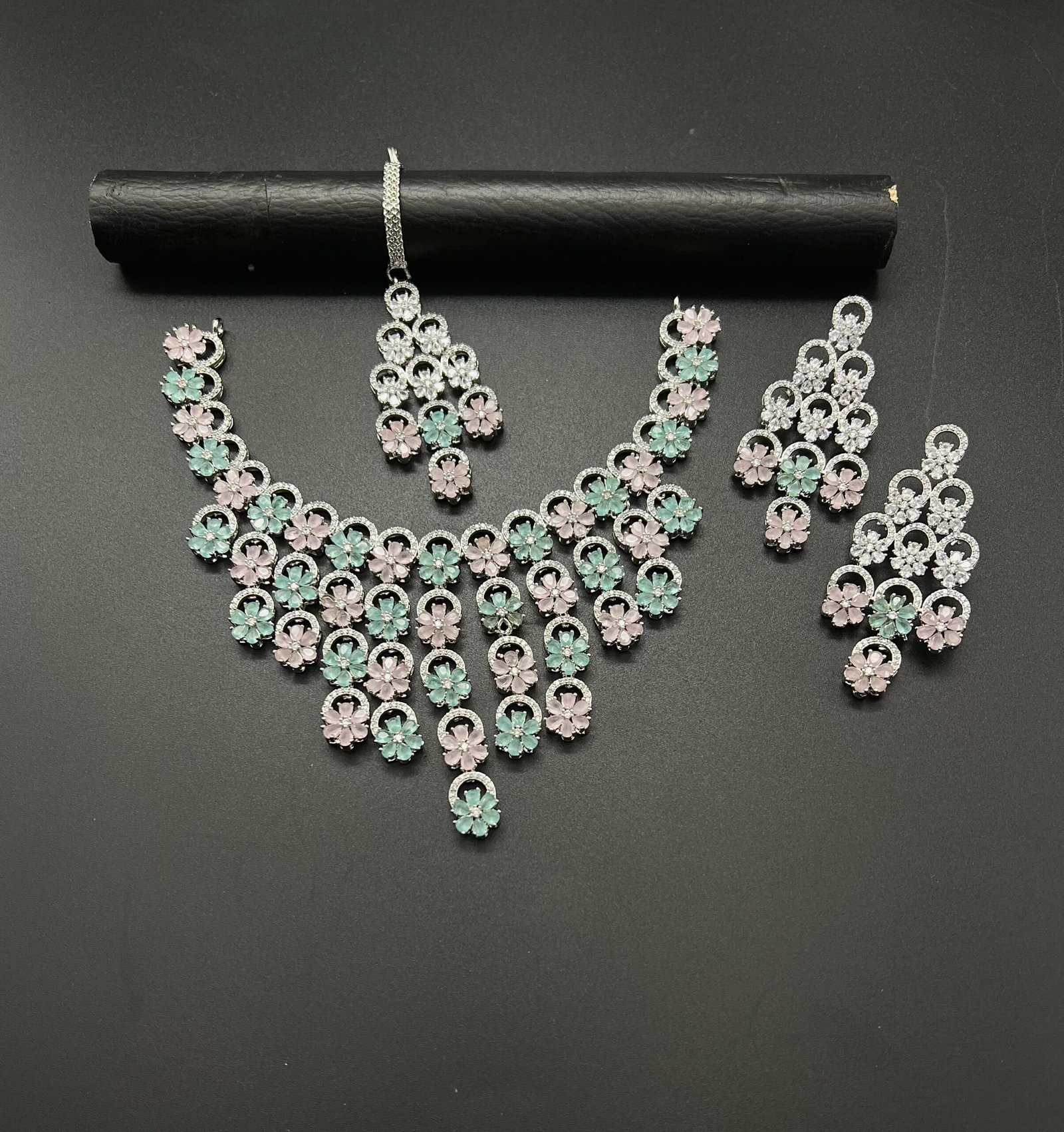 Bridal partywear set with mint and pink floral stones in a silver-plated zircon finish—crafted for timeless elegance.