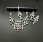 Elevate your bridal elegance with this silver-plated partywear set, featuring delicate pink and mint floral stones surrounded by dazzling zircon accents for a breathtaking finish.